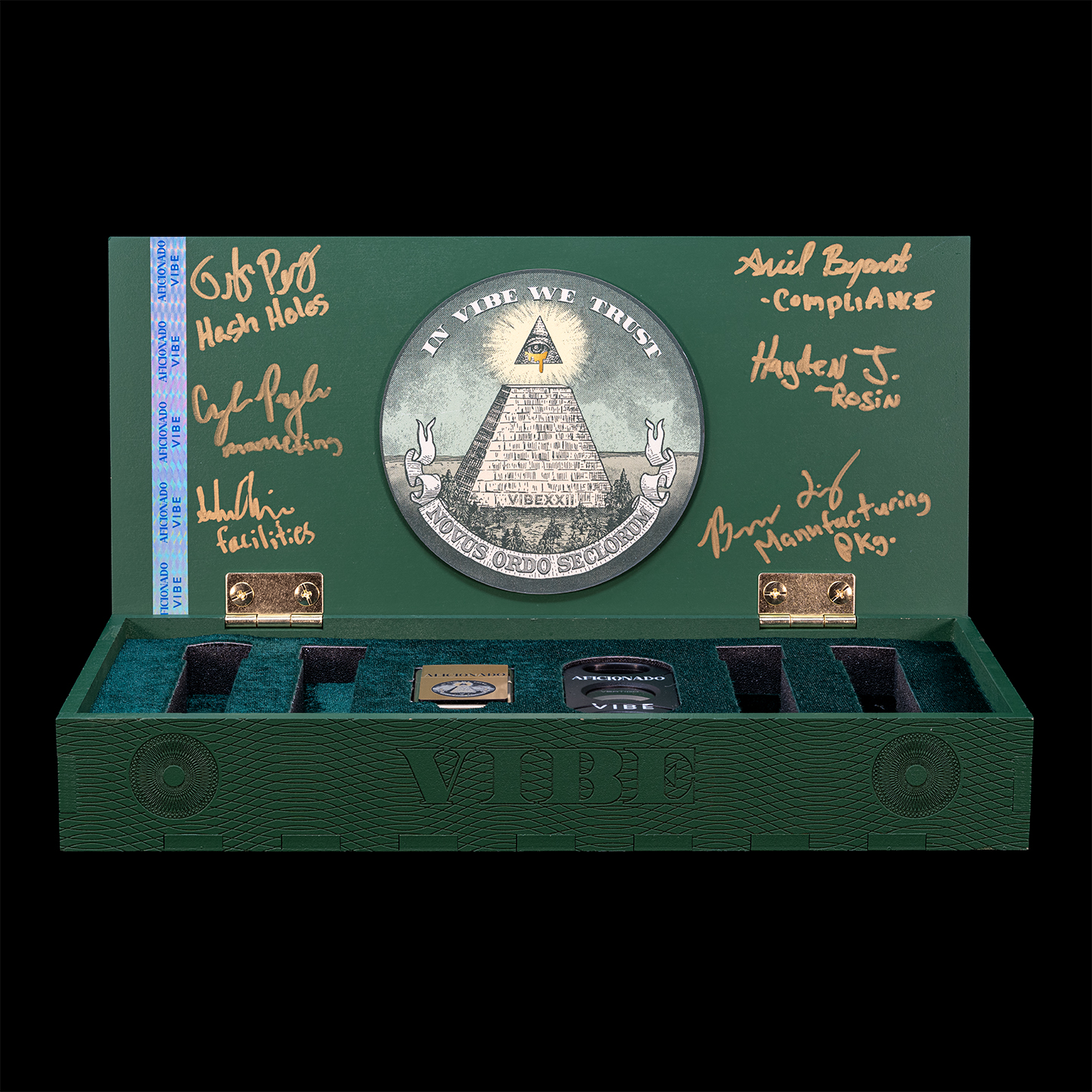 The Aficionado VIBE – In VIBE We Trust collector’s box and accessories include:
